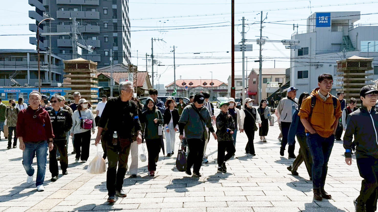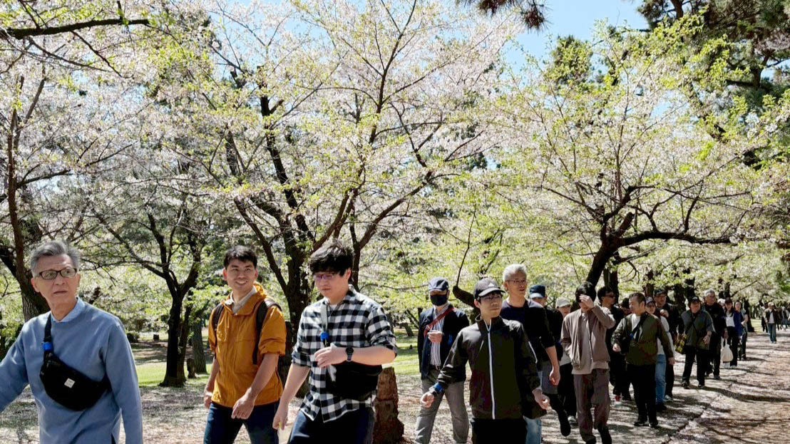 前日の春の嵐から一転、当日は春らしい晴天に恵まれ、桜もまだ残る中での開催となりました。参加者82人のうち61人がウォーキングから参加し、南海本線浜寺公園駅に集合後、園内のウォーキングコースを約1時間かけて歩きました。組合の仲間同士や家族同士、また当日初めて出会った参加者同士で会話を楽しみながら、ゆったりとした時間を過ごしました。