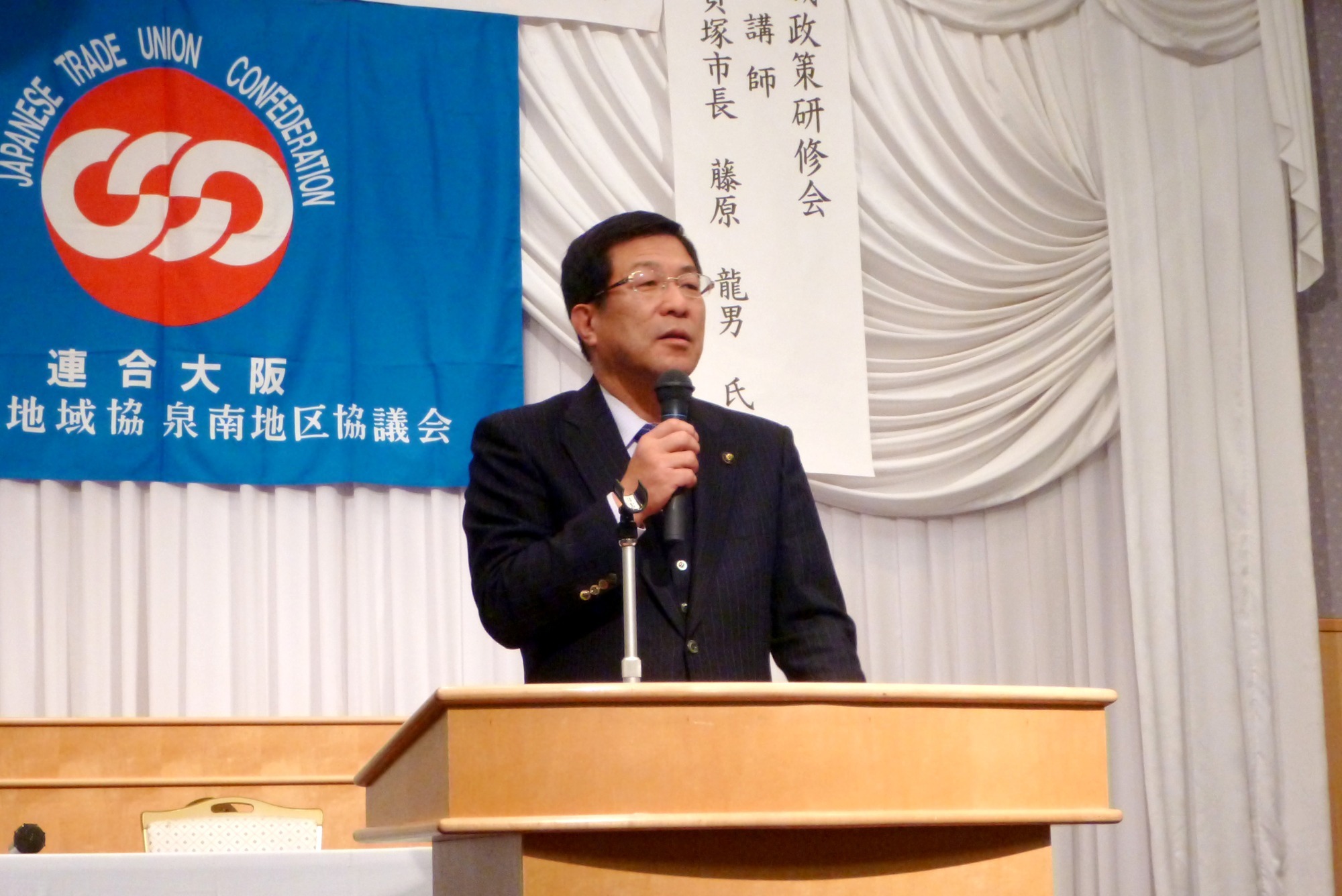 第2部では地域政策講演会として、連合大阪推薦の藤原龍男貝塚市長から「貝塚市政について」と題し、今後4年間における貝塚市政のビジョンについて講演会を行いました。