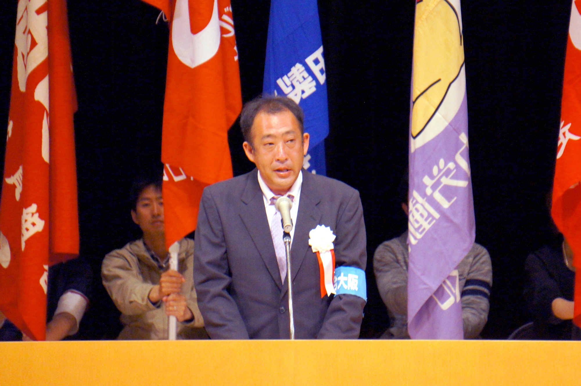 また、連合推薦の各級議員団を代表して、梅村聡参議院議員から「本来ならば労働組合と経営者側そして公益側の三者で話し合われなければならない労働施策について、与党は圧倒的支持率を背景に、労働組合を置き去りにして勝手に進めている。産別の意向を政府へ伝えるためには産別推薦候補者の勝利に向けて皆さんの結集をお願いしたい。私も大阪の皆さんの代表としてがんばる」との参議院必勝に向けてのあいさつがあり、また、自治体推薦議員を代表して阪南市議会議員の木村議員からは「働く人の立場に立って、また連合大阪の施策を推進していく自治体議員の一人として、何でも相談できる身近な議員という立場を守り、これからもがんばっていく」と力強いあいさつがありました。